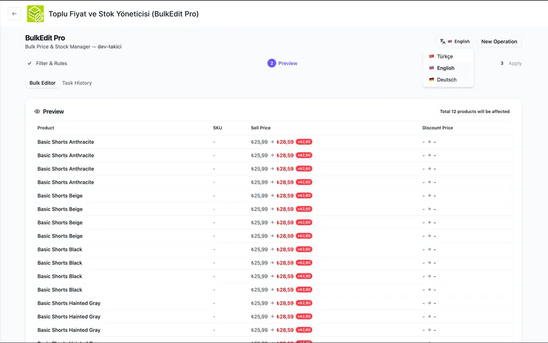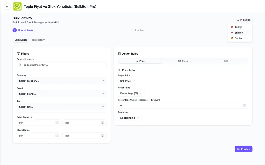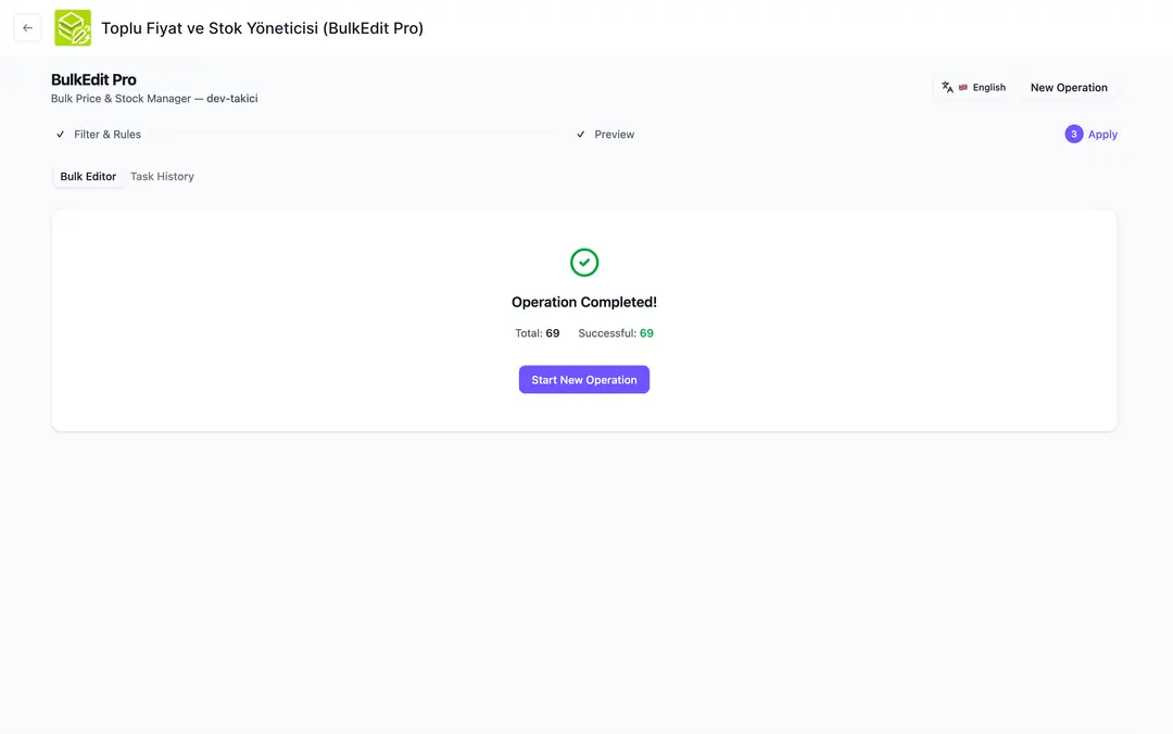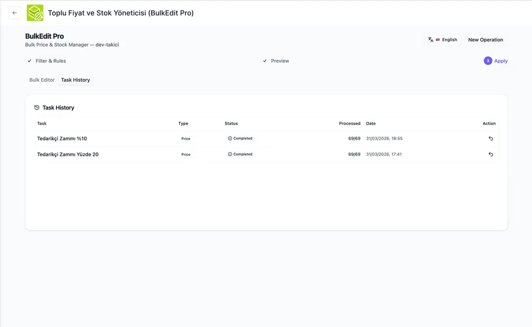 BulkEdit Pro is a powerful and secure bulk editing assistant that eases the operational burden of your ikas store. Apply your pricing strategies instantly, easily update your stocks from a single screen, and dedicate your saved time to growing your business. The app works fully integrated with your ikas admin panel, providing a seamless experience.